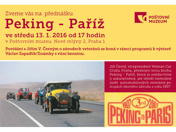 Jiří Černý, víceprezident Veteran Car Clubu Praha, představí svou knihu Peking - Paříž, která je svědectvím o uskutečněné, ale téměř nemožné jízdě automobilových veteránů po stopách dávného závodu z roku 1907. Povídání s Jiřím V. Černým se koná v rámci doprovodných programů k výstavě Václav Zapadlík/Známky s vůní benzínu