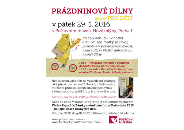 Zveme vás a vaše děti do Poštovního muzeu v Praze o pololetních prázdninách v pátek 29. 1. 2016. Po celý den od 10 do 17 hodin bude v muzeu čtení knížek, hrátky se slovy, proměna v pohádkovou bytost, jízda autíčky vlastní autodráhou a další dílny.