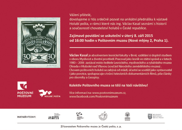 Ojedinělá přednáška ing. Václava Kasala k výstavě Holubí pošta se uskuteční v úterý 8. září od 16 hodin v Poštovním muzeu. Václav Kasal je oborník na chov holubů, který se mimo jiné účastní soutěží jako vystavovatel i jako porotce, a bude zajímavě vyprávět o historii i současnosti chovatelství holubů v České republice.