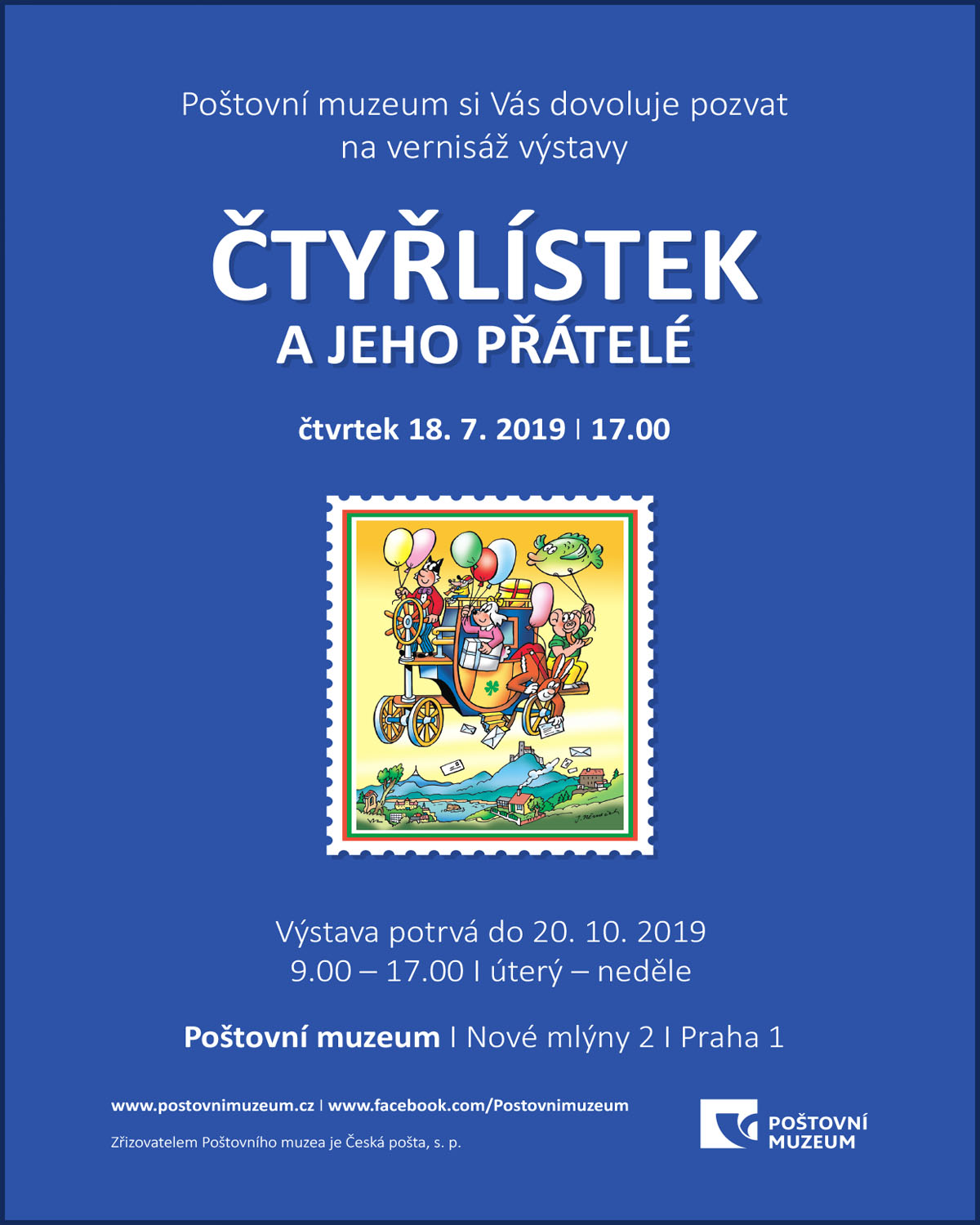 Zveme Vás na zahájení výstavy Čtyřlístek a jeho přátelé ve čtvrtek 18.7. 2019 v 17 hodin v Poštovním muzeu v Praze. Výstava představuje známkovou tvorbu duchovního otce Čtyřlístku Jaroslava Němečka a jeho přátel, kteří během padesátileté historie do stejnojmenného komiksového časopisu pro děti tradičně přispívali.