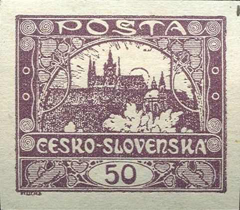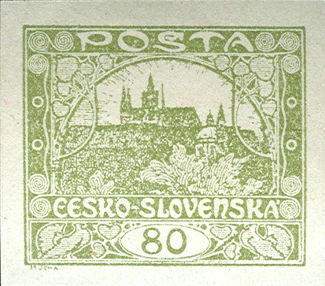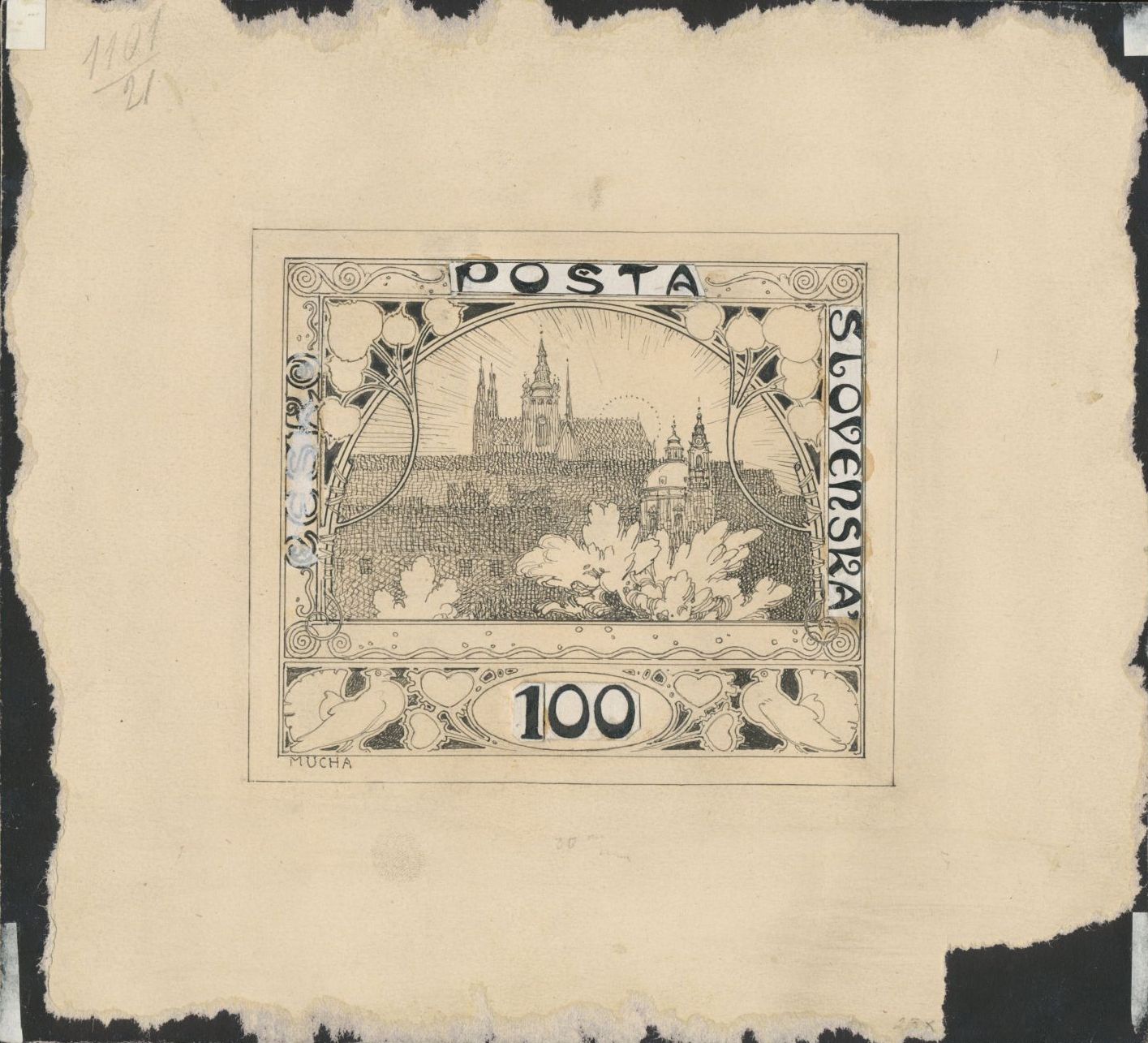 V roce 1918, po vzniku státu, se rychlému a kvalitnímu vyhotovení známky jako státního symbolu přikládala velká důležitost a nově ustavená poštovní správa pro ni hledala opravdu povolaného autora. Mistra Muchu o návrh požádala již 30. října 1918 s tím, že kvůli reprodukci výplatní známky, na které státu záleželo nejvíce, musel být vypracován do dvaceti čtyř hodin. Světově proslulý představitel secese předložil několik námětů, z nichž se jako nejméně konfliktní jevilo panorama Hradčan, sídla českých vládců, od středověku symbolicky spjatého s osudem národa.