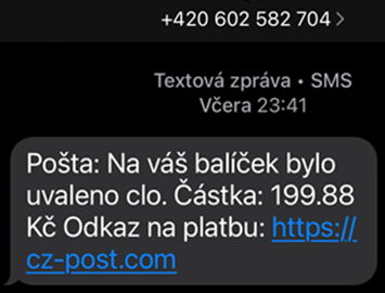 Česká pošta opět varuje zákazníky před podvodnou SMS zprávou, která předstírá, že byla odeslána z České pošty. Informuje zákazníka, že jeho balíček čeká na zaplacení poplatku. Má ho zaplatit kliknutím na odkaz.