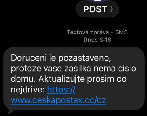 Česká pošta opět varuje zákazníky před podvodnou SMS zprávou, která předstírá, že byla odeslána z České pošty. Informuje zákazníka, že je doručení pozastaveno, protože jeho zásilka nemá číslo domu. Má aktualizovat co nejdříve.