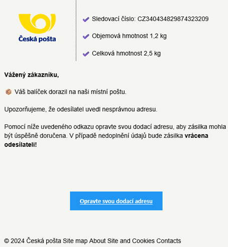 Česká pošta opět varuje zákazníky před podvodným e-mailem, který předstírá, že byl odeslán z České pošty. Informuje zákazníka, že jeho balíček dorazil na jejich místní poštu. Upozorňují, že odesílatel uvedl nesprávnou adresu. Pomocí uvedeného odkazu má opravit svou dodací adresu, aby mohla být zásilka úspěšně doručena.