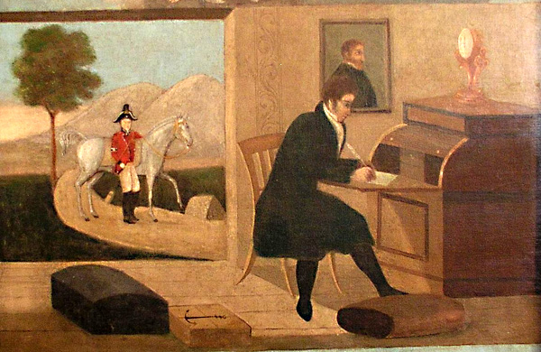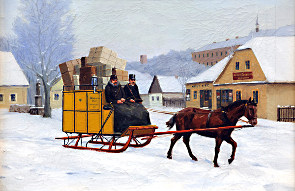 Other paintings in the museum's property with transportation-related motifs, have a higher value; the most valued is the 1818 portrait of a Napoleonic rider by George Ridel. Portraits of 18th and 19th-century hereditary post office administrators, postmasters and postal directors are also frequently represented in the sub-collection, although only a few were autographed by the painter (e.g. the 1824 portrait of postal director Augustin Schöbl by Vojtěch Staubmann) while the rest remained unsigned (e.g. the 1820 portrait of postmaster Doubek from Votice, portrait of Tábor's postmaster and mayor Jan Antonín Sebenarz from the second half of the 18th century, portrait of postal director František Šafařík Pštross from the second half of the 19th century, and others). A recent acquisition - Rococo, Classicism and Biedermeier portraits of hereditary Litovel postmasters Jakub, Karel and Gustav Rettigs - also belong to this set of paintings. Other paintings include official portraits of rulers, in most cases Franz Joseph I; his portrait by J. Böhm. made as a copy of an original by František Ženíšek, was originally owned by the Prague-based Headquarters of Post and Telegraph Offices.