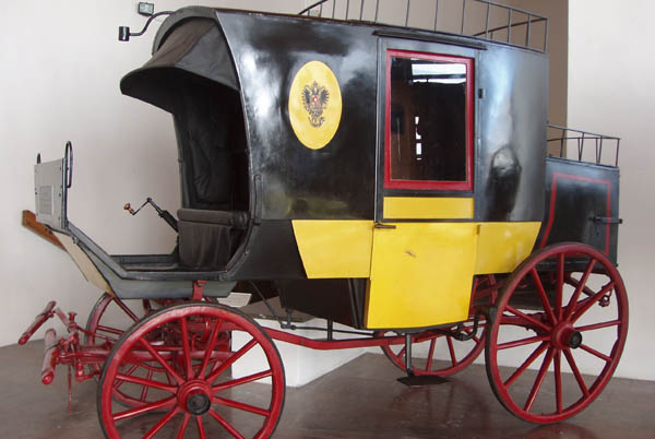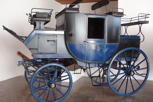 Dvoumístný kočár využíval rakouský císař Ferdinand I. (1793-1875) po abdikaci roku 1848 během mnohaletého pobytu v Praze. Tažen byl dvěma nebo čtyřmi koňmi, je vybaven kozlíkem pro kočího a plošinou pro dva lokaje stojící v zadní části vozu. Poštovnímu muzeu ho roku 1930 daroval Památník osvobození.