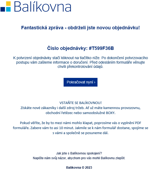 V předmětu zprávy figuruje název: Balíček byl zaplacen společností Balikovna.cz!