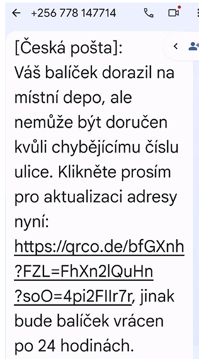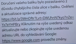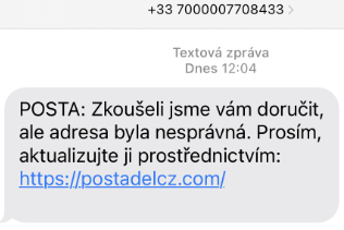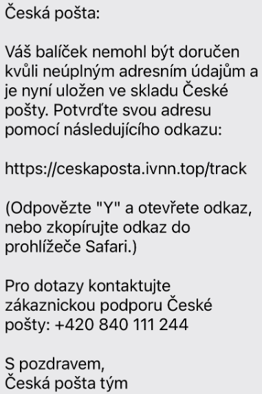 Česká pošta opět varuje zákazníky před podvodnou SMS zprávou, která předstírá, že byla odeslána z České pošty. Informuje zákazníka, že jeho balíček nemohl být doručen, protože jejich systém zjistil neúplné informace o adrese. Prosí ho, aby co nejdříve potvrdil nebo změnil svou adresu pomocí uvedeného odkazu.