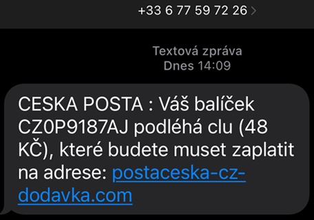 Česká pošta opět varuje zákazníky před podvodnou SMS zprávou, která předstírá, že byla odeslána z České pošty. Informuje zákazníka, že je jeho objednávka připravena k dodání. Má potvrdit celní poplatek (67,28 CZK) přes uvedený odkaz.