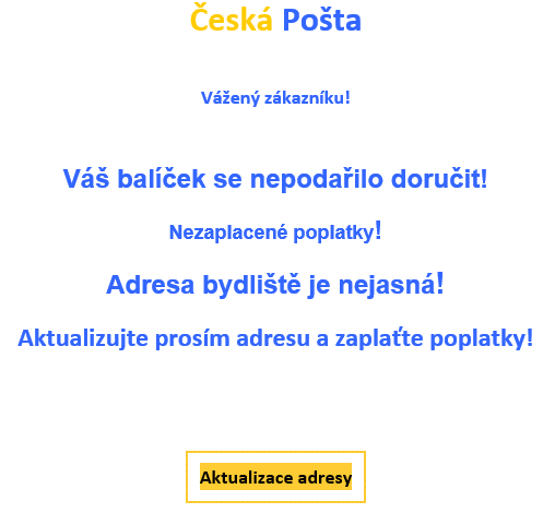 Česká pošta opět varuje zákazníky před podvodným e-mailem, který předstírá, že byl odeslán z České pošty. Informuje zákazníka, že se jim nepodařilo doručit jeho balíček, protože jím uvedená adresa se zdá být nesprávná. Prosí, aby si aktualizoval co nejdříve své adresní údaje, aby mohli jeho zásilku úspěšně doručit.