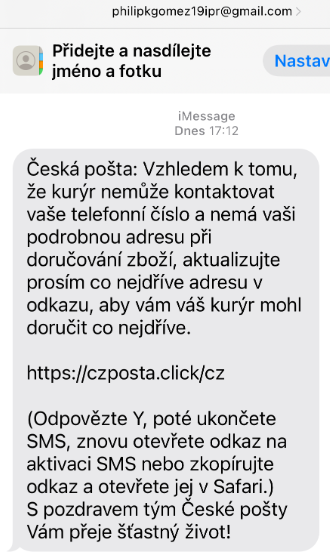 z České pošty. Informuje zákazníka o neúspěšném pokusu o doruční zásilky. Má přejít na odkaz