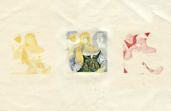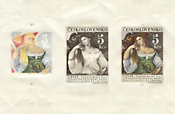 Tiskové postupy ke známce - Toaleta mladé ženy (žlutá, soutisk: modrá, zelená a žlutá, červená) -